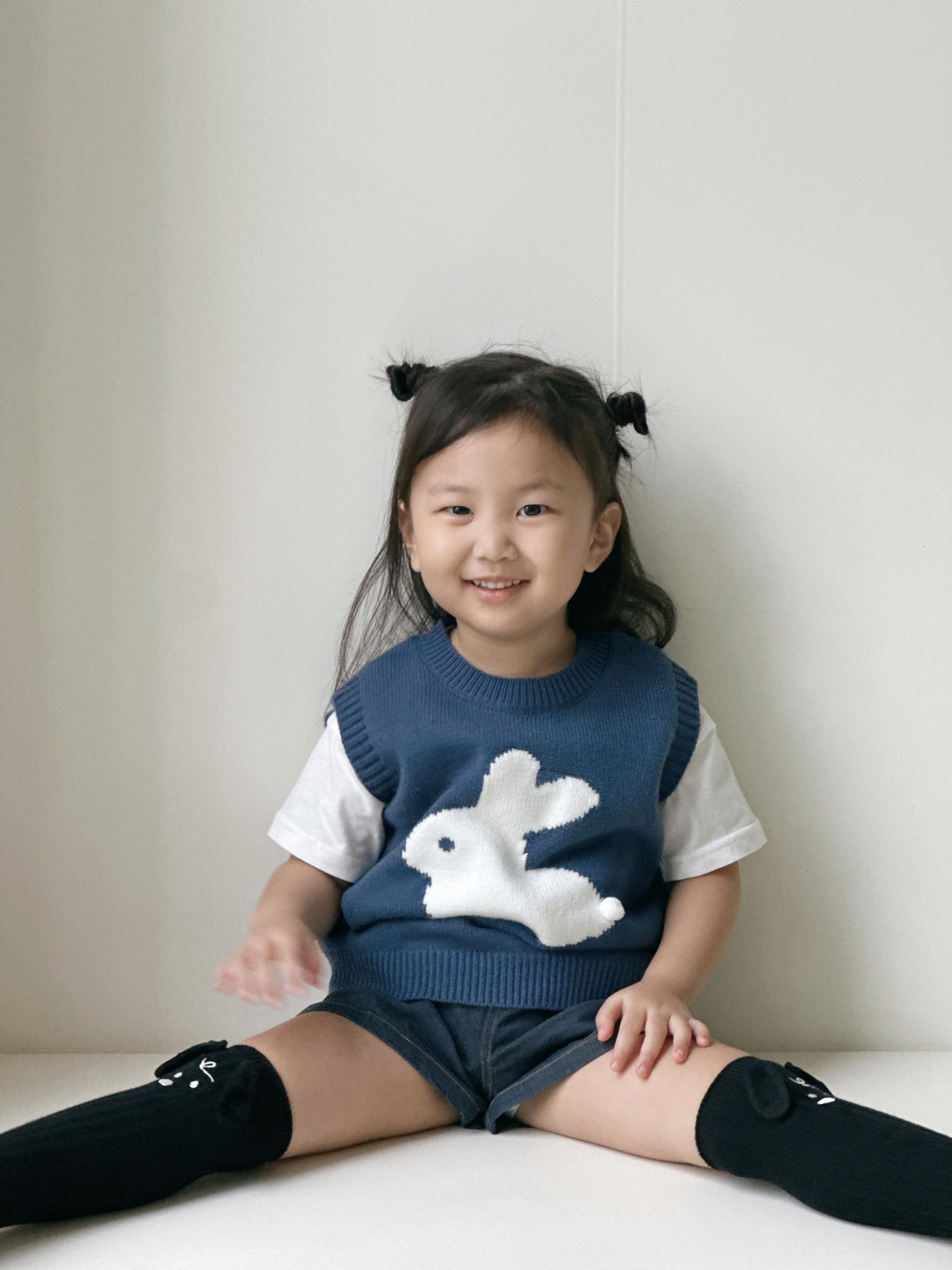- 선명한 블루 컬러 위에 귀여운 토끼 그래픽이 포인트로 들어간 니트 베스트입니다.