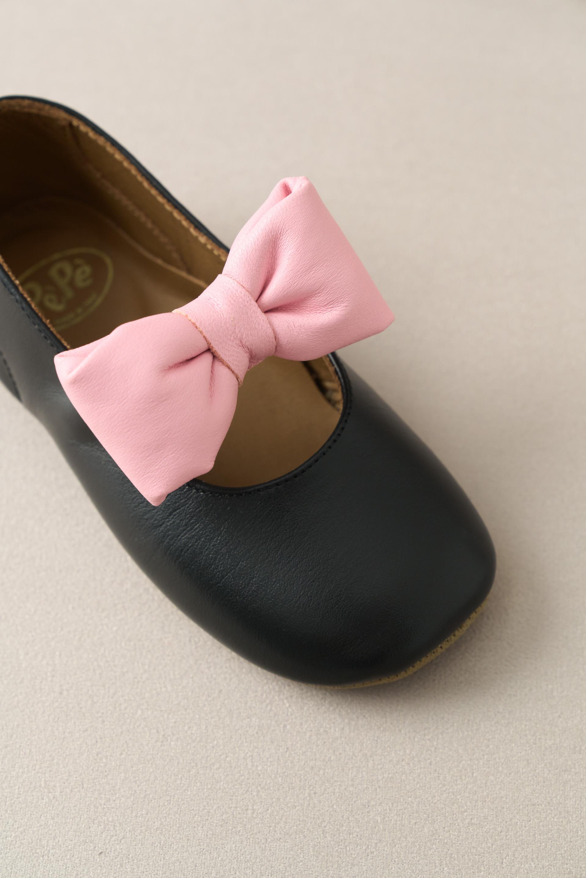 - 은은하게 광택감이 도는 블랙 바디에 입체적인 핑크 리본을 더해, 클래식하면서도 사랑스러운 발레리나 플랫 슈즈입니다.
